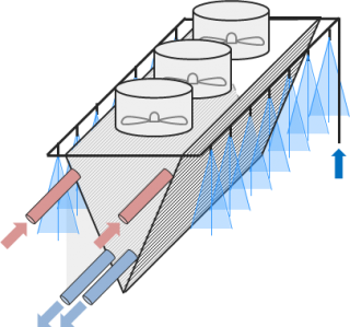 Circuit water goes in hot and is spray and mixed with in air inside the tower. A part of this circuit water is vaporized and goes out with hot air. To compensate this circuit water loss, external water is mixed with warm circuit water injected back to datacenter.